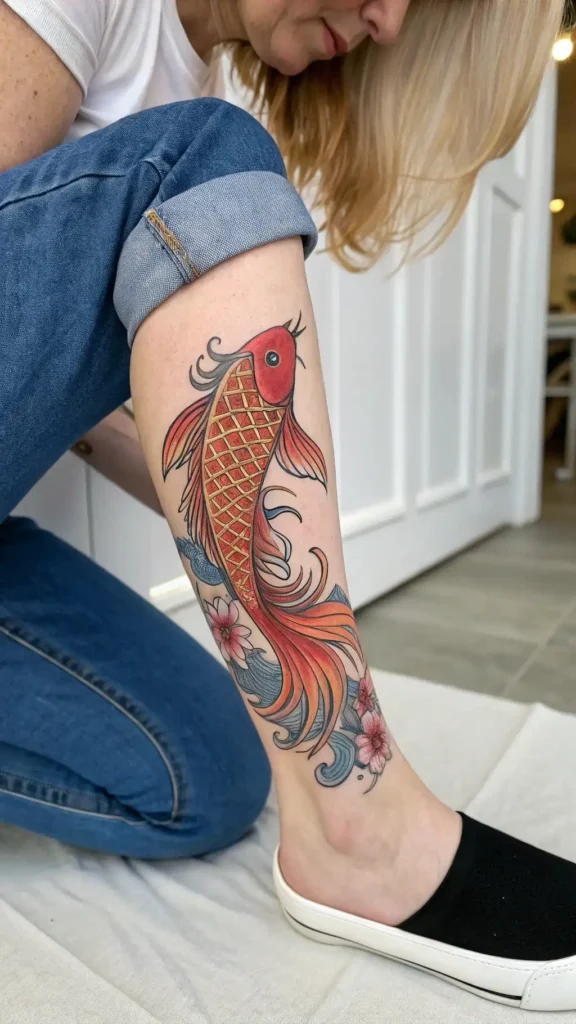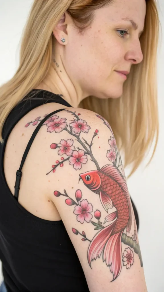 The fish can be placed in a flowing motion, creating a sense of movement and energy. You can also incorporate other design elements, such as Japanese waves or cherry blossoms, to add depth and meaning to your tattoo.
