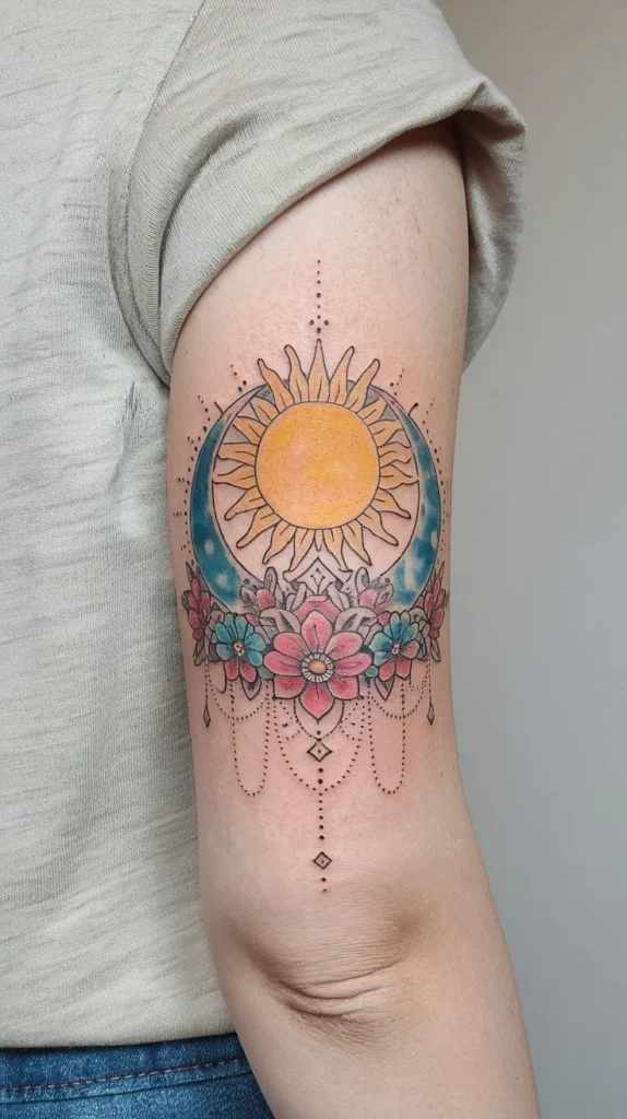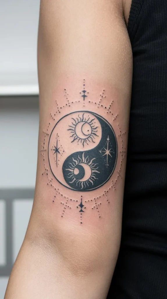 As you contemplate a celestial-themed tattoo, a design that embodies the harmony between the sun and moon can be a powerful symbol of balance in your life.